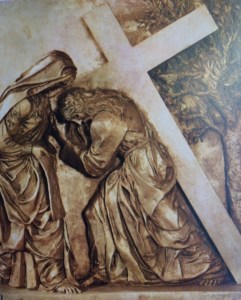 Legends sprang up sometime later about a woman named “Veronica,” who was sometimes associated with the woman “Berenice” or “Bernice,” the bleeding woman who touches the hem of Jesus’s garment in the Gospel. There is a version, written in 1191 by Robert de Boron, that tells of a woman named “Veronica” wiping sweat from the Face of Jesus. The stories are many and varied, but the legend that most people are familiar with today is traced to a version by Roger d’Argenteuil in the 1300s, which tells of a woman “Veronica,” associated with the sixth station of the Cross–the compassionate woman, wiping the Face of Jesus on the way to Calvary with a cloth, upon which He leaves an image of His Face.