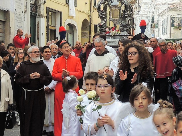 Sunday, May 21st, was a day of great celebration and joy, commemorating the arrival of the Holy Veil, bearing a miraculous image of the Face of Jesus, to Manoppello, Italy, centuries ago. The town of Manoppello welcomed Cardinal Tagle of the Philippines, who presided at the Solemn Mass and Procession of the Veil of the Holy Face from the Basilica Shrine to San Nicholas Church in the city center. The Veil is to be brought back to the Sanctuary Basilica the next day.