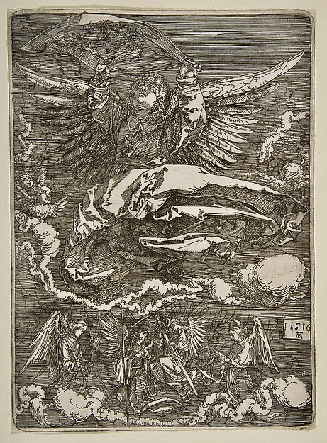 St. Michael soars above the Heavens bearing the Veil of the true image of the Face of Christ. 1516, Albrecht Durer