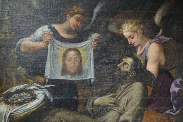 What is so fascinating about the painting of the Face of Christ from St. Roch’s Chapel are the eyes – which the viewer is immediately drawn to. The painting portrays Jesus with His eyes open, as it was commonly seen in works of art centuries before, when the actual relic of the true image, or ” Veronica,” could still be seen at the Vatican by pilgrims to Rome, and copied by artists. (History) After the Sack of Rome in 1527, it was reported that the Veronica had been stolen. Although the theft has never been admitted to by the Vatican – the loss of such a precious relic would have been scandalous – pilgrims were suddenly no longer able to view the veil.