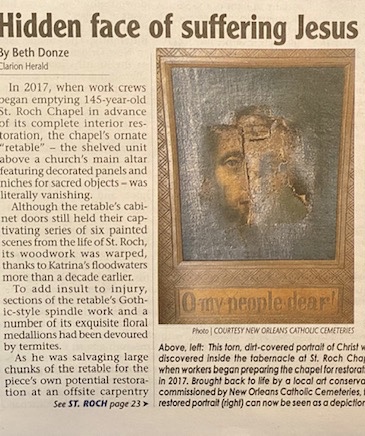 An amazing discovery was made inside the Chapel of St. Roch Cemetery No. 1, in New Orleans, Louisiana, in 2017. Hidden away where the tabernacle had been was an old, deteriorated painting of the suffering Face of Jesus. St. Roch’s Chapel had been badly damaged by water and termites following Hurricane Katrina in 2005. Although the chapel had been built in the 1870’s, the age of the painting could not be determined. The challenging restoration, completed in 2021, revealed that the painting had been restored at least once before, and re-stretched on a frame, losing what appears to have been a painted cloth veil surrounding the face, as well as the date or signature of an artist – if indeed there was a signature on the original. (See the full Clarion Herald article by Beth Donze, and photos of damaged painting and restoration: Link to article )