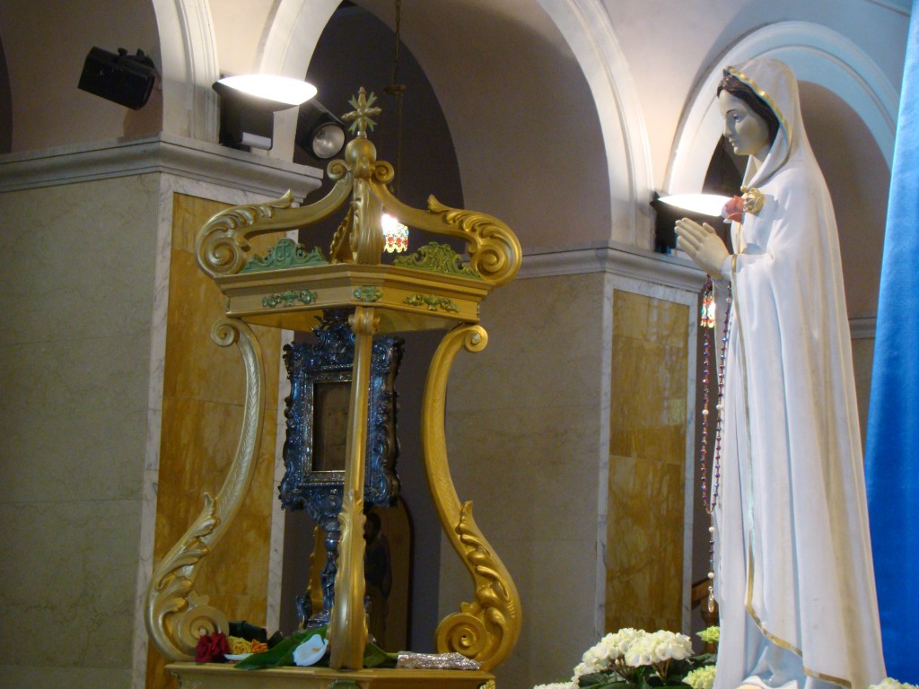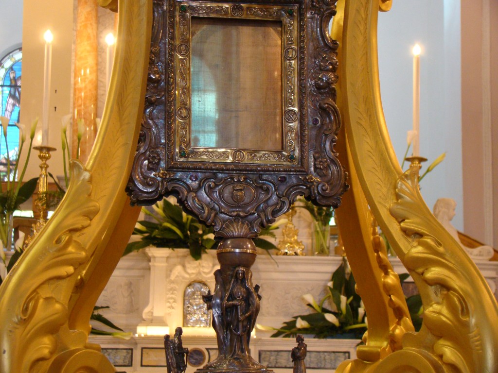 The Holy Veil remained the property of the Leonelli family for nearly a century, until a family member in need of money sold the Veil to Don Antonio Fabritiis, who in turn gave it to the Capuchins in 1638. The Holy Veil, called the “Il Volto Santo,” was kept in a dimly lit side chapel until the church was renovated in 1960, when it was decided that the Veil should be moved to a more prominent place behind the altar of the church of St. Michael, the Shrine of “Il Volto Santo,” which was elevated to the status of a Sanctuary Basilica by Pope Benedict XVI in 2006.