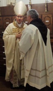 Archbishop Ganswain holding the replica of the Holy Veil of Manoppello at Spirito Santo in Rome for the Year of Mercy.