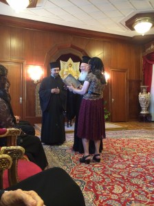 Patriarch Bartholomew with Daisy Neves and the “True Icon” the Holy Veil of Manoppello.