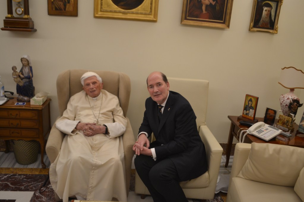 The last photo that exists of him shows him on December 10, 2022 with my friend, Michael Hesemann in his [Pope Benedict’s] study. [One can see] in the monastery “Mater Ecclesiae,” richly decorated with paintings, Benedict’s telephone table: To the right of an icon of St. Benedict of Nursia, he [Pope Benedict XVI] could gaze, until his last breath, at a transparent copy of the “true image” of the Holy Face — that he alone brought back to the world.