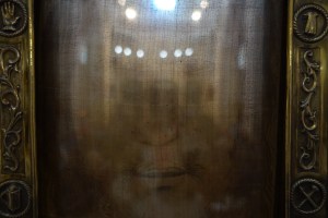 In the photo above Padre Domenico appears to intently contemplate a square, white cloth–but the seemingly blank cloth is actually so much more–it is something miraculous! You will see in the many photos below, by Alexandra Prandell and Paul Badde, that what at first appears as a plain white cloth is actually the Holy Veil of Manoppello which bears the Holy Face of Jesus–on a veil so sheer that one could read a book through it–and yet, according to the the light and position of the viewer, the Holy Face of Jesus is visible. Padre Domenico personally believed that the veil was the Sudarium Veil placed on the Face of Jesus in the Tomb in addition to other burial cloths, and that the veil captured the first moment of the Resurrection.